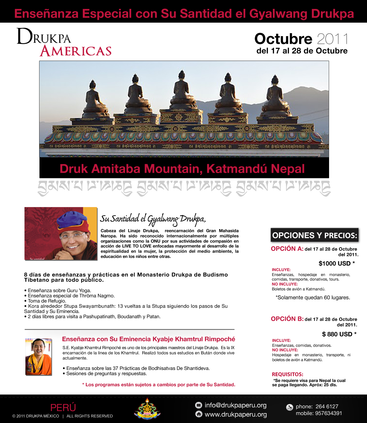Drukpa Américas: Brasil, México, Perú y Estados Unidos, octubre del 2011 en Druk Amitaba Mountain Katmandú Nepal. Estamos en el proceso de abrir formalmente el registro, probablementepara la semana próxima tendremos todos los detalles. Les pedimos amablemente que nos hagan el favor de anunciarlo en sus sitios web o como consideren apropiado.